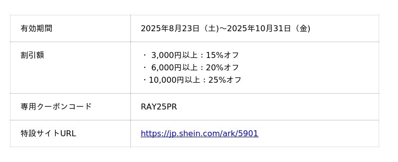 今回は、「SHEIN」×『Ray』のタイアップを記念し、最大25%オフにてお買い物をお楽しみいただける期間限定クーポンを配布しております。ぜひこの機会に、HITOMIさんが着用した秋冬のトレンドコーデをお楽しみください。■クーポン概要