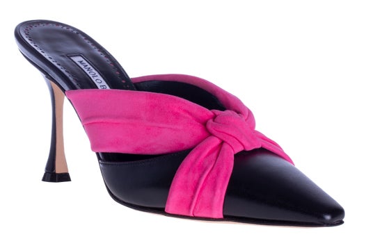 ピンクスエード×ブラックレザーのミュールは、大胆なピンクスエードのノットデザインが印象的で、コントラストの効いたブラックレザーとの組み合わせが洗練されたスタイルを叶えます。流れるようなプリーツが印象的なブラックスエードのミュールは、ローレンのシグネチャーであるドラマティックなドレープを彷彿とさせ、あしらわれたクリスタルディテールとともに、エレガントなムードを纏います。