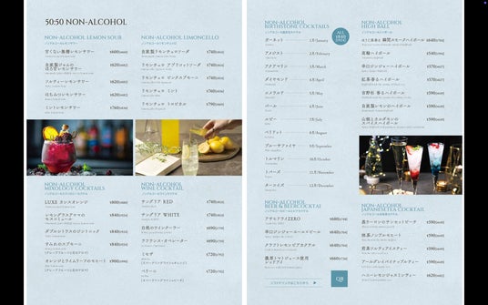 ドリンクは、アルコールとノンアルコールが総勢100種類以上。中でもオリジナルノンアルコールカクテルとミクソロジーに注目!※予告なく内容を変更する場合がございます