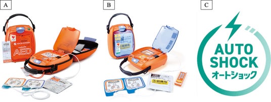 コースで使用したトレーニング用AED(引用:日本光電株式会社)。[A] 半自動型(従来型)AED(TRN-3100)、[B] 全自動型AED(TRN-3150)、[C] 全自動型AEDを示すロゴマーク(引用:一般社団法人電子情報技術産業協(JEITA))