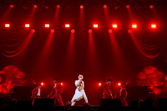 お城の大階段ロビーを思わせる背景映像からつながる階段を降りながら、「今日は来てくれてありがとう。最後まで一緒に楽しもうね!」と笑顔でリスナーに呼びかけ、莉犬自身が作詞を手掛けた「リバースデイ」ではダンサーと一緒に軽やかに踊ったり、歌詞に合わせて抱きしめポーズをしたり。赤のレーザー光線が飛び交いファイヤーボールが勢いよく噴き上がったハイテンポな「オッドアイラヴ」では、歌もダンスもクール&ダイナミックにきめたり。「これからも推してくれる?」という言葉に続いた「最強☆最推しセンセーション!!」では、当然<ガチで恋して>しまうキュートな歌声と振り付けで翻弄したり。ますます磨かれた歌とダンス、目まぐるしく楽しい千変万化にリスナーも全力のコールで応えて、莉犬のイメージカラーである赤いペンライトの光が客席で大きく揺れる。序盤から、すさまじい一体感だ。