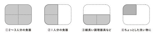 「2~3人分の食器」や「1人分の洗い物」、「細長い調理器具」、「少量の洗い物」など、用途や使う場所に合わせて広さを調整できるので、限られたキッチンスペースでもムダなく活躍します。