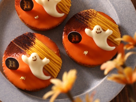 発酵バターとアーモンドの風味豊かな生地にかぼちゃパウダーを加えて焼き上げ、かぼちゃの甘みが広がるクリームを絞った濃厚なかぼちゃの味わいがお楽しみいただけるガトー・ナンテ。ハロウィンカラーのアイシングとホワイトチョコのおばけを飾りました。