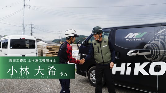 第一回「HiKOKI BUILDERS SPIRIT AWARD」で総合グランプリを受賞された小林大希さんが現在携わる土木建設の作業現場を訪問し、授賞式以来の再会を果たします。