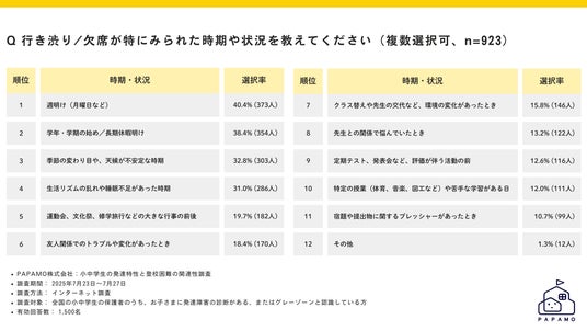 行き渋りや欠席が特に見られた時期・状況を複数回答で聞くと、週明け(月曜日など)が40.4%と最も多く、学年・学期の始め/長期休暇明け(38.4%)、季節の変わり目や天候が不安定な時期(32.8%)、生活リズムの乱れや睡眠不足があった時期(31.0%)、運動会、文化祭、修学旅行などの大きな行事の前後(19.7%)と続きました。