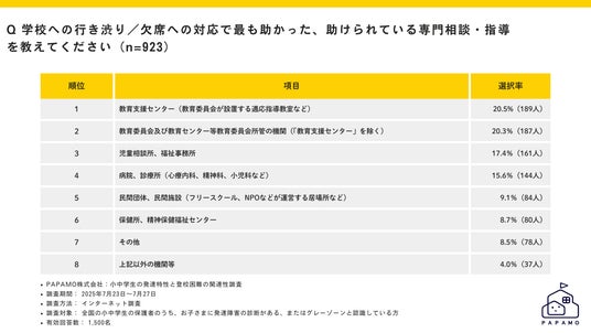 学校への行き渋り/欠席への対応で最も助かった・助けられている専門相談・指導を聞くと、教育支援センター(教育委員会が設置する適応指導教室など)が最多で、教育支援センターを除く教育委員会および教育センター等教育委員会所管の期間、児童相談所・福祉事業所と続きました。