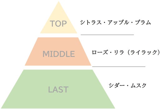シトラスやアップル・プラムのフルーツ調のトップノートに、ローズ・リラなどのフローラル調の香りが続き、ラストにシダーやムスクでまとめた、爽やかで清潔感のあるクリアブルームの香り。男女ともに使いやすいジェンダーレスな香りです。