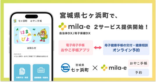 ミラボ、宮城県 七ヶ浜町で、母子保健DX「mila-e」母子手帳アプリ・オンライン予約の提供を開始