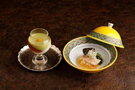 料理名:「ココナッツパンナコッタ ~2種の日本茶仕立て~」「甘鯛根深蒸し 揚げ胡麻豆腐」