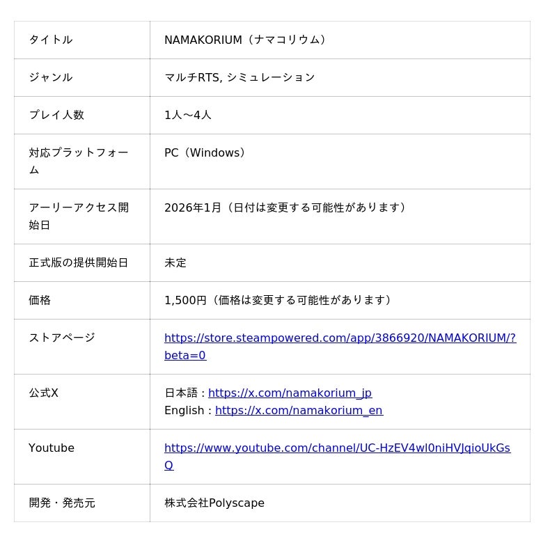 「未来を、前倒す。」をミッションとする株式会社Polyscape(本社:東京都港区、代表取締役:島田寛基、以下「当社」)は、新作インディーゲームとなる、海の掃除屋ナマコが主役のカジュアルマルチプレイRTS「NAMAKORIUM(ナマコリウム)」のアーリーアクセス版を2026年1月にSteamにてリリース予定であることを発表すると共に、第一弾PVを公開します。