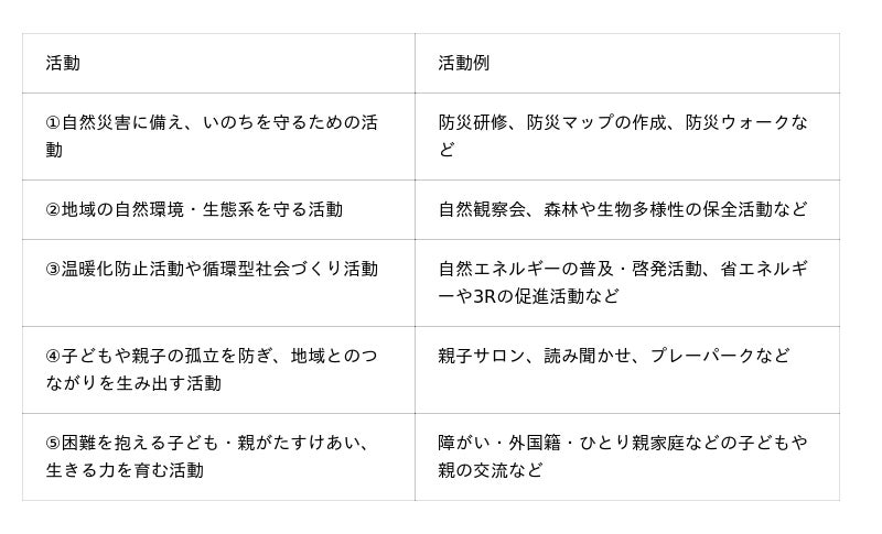 本助成はその取り組みの一つであり、6つの重要課題のうち「環境保全」「子どもの健全育成」