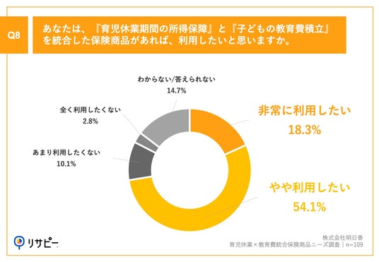 「Q8.あなたは、『育児休業期間の所得保障』と『子どもの教育費積立』を統合した保険商品があれば、利用したいと思いますか。」(n=109)と質問したところ、「非常に利用したい」が18.3%、「やや利用したい」が54.1%という回答となりました。(※育児休業期間中に一定額の所得保障を受けられ、同時に子どもの教育費を積み立てられる商品をイメージしてください。)