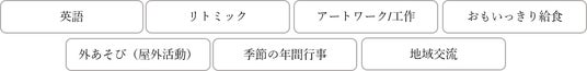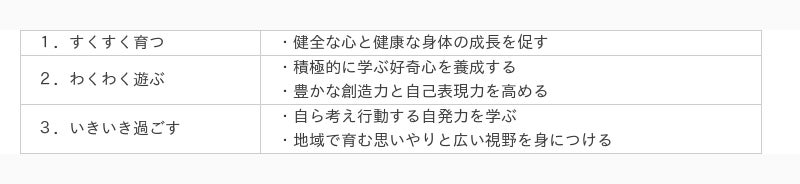 「おもいっきり遊ぶ。おもいっきり学ぶ。」を保育理念とし、更に、以下の保育目標を掲げています。