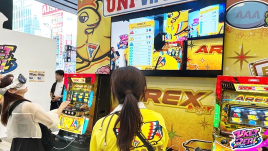 株式会社ユニバーサルエンターテインメントでは、7月7日導入の新機種「アレックス ブライト」をMRゴーグル「Apple Vision Pro」で試遊できる特別展示を実施。プレイ中に遊び方の説明や特別演出が重ねて表示される仕掛けで、最大70分待ちの盛況となりました。体験後にはルーレットでオリジナルグッズが当たる企画もあり、「家の近くのパチンコ屋さんにあったら絶対やりたい!」といった声が聞かれるなど、XRで進化したパチスロ体験が来場者の記憶に残りました。