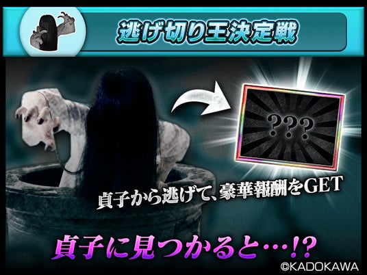 貞子からの追跡をどこまでかわしきれるか、プレイヤー同士で“逃走力”を競い合います。