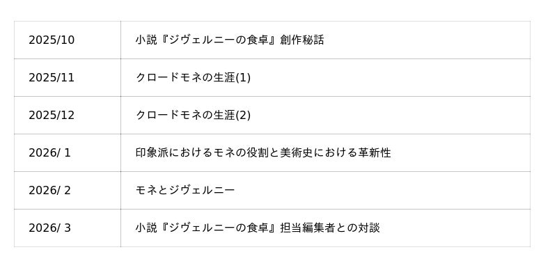 原田マハさんが講師を務めナビゲートする、感性と共鳴からはじまるアートの学びの場。自身のアート小説を課題図書とし、芸術家の人生や、美術史的背景、そして作品に込められた思いを紐解きます。レクチャーシリーズ第一期(2025年10月~2026年3月)は、小説『ジヴェルニーの食卓』を題材とし、クロード・モネの実像と紐解くと同時に、印象派が誕生した美術史的背景を理解し、モネや印象派への作品理解を深めます。