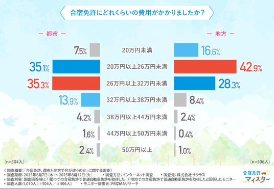 そこで今回、合宿免許比較サイト「合宿免許マイスター」(https://menkyo-meister.com/)を運営する株式会社サクラスは、1.都市での合宿免許で普通自動車免許を取得した方/2.地方での合宿免許で普通自動車免許を取得した方を対象に、「合宿免許、都市と地方で何が違うのか」に関する調査を実施しました。