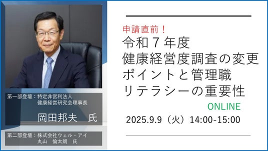 株式会社ウェル・アイは、2025年9月9日(火)に「令和7年度健康経営度調査関連ウェビナー」を開催します。本ウェビナーでは、健康経営研究会 理事長であり、企業の健康経営推進に長年携わってきた岡田邦夫氏をお招きし、最新の健康経営度調査に関する重要な情報をお届けします。