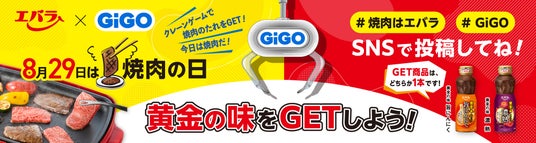 イベント当日に、XやInstagramにて「#焼肉はエバラ」「#GiGO」をつけてイベントの様子を投稿し、イベントスタッフから整理券を受け取ると、「黄金の味 旨にんにく」もしくは、「黄金の味 濃熟」どちらか1本を獲得するまで、何度でもクレーンゲームにチャレンジすることができます。8月29日の「焼肉の日」に本コラボイベントを開催することで、新たなお客さまとの接点の拡大を図ってまいります。