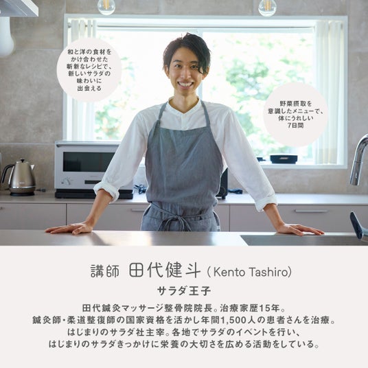 講師は、栄養の大切さを広めるために、「サラダ王子」として全国各地でサラダのイベントを行っている、田代健斗さんです。田代さんの考案したレシピは、手軽でおいしく、忙しい日常にも取り入れやすい工夫が詰まっていて、食生活のバランスを見直すきっかけになります。