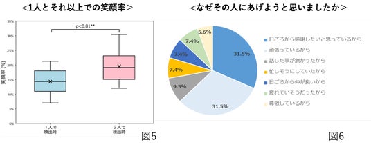 図5は、全期間の表情計測結果において、1人で検出される時に比べ、2人で検出される時の方が統計的に有意に向上しました(5%有意水準, p=0.01)。すなわち、一人でコーヒーを入れるより複数人でコーヒーを入れるほうが、ともに笑いあい(笑顔が共起され)、笑顔の発生率が有意になる事が分かります。また図6の「コーヒーをあげる理由」では「日ごろから感謝したいから」(31.5%)と「頑張っているから」(31.5%)等が主な理由となり、「どんな人にコーヒーを淹れたか」という質問では、過半数の人が同僚・チームメンバーを挙げていました。
