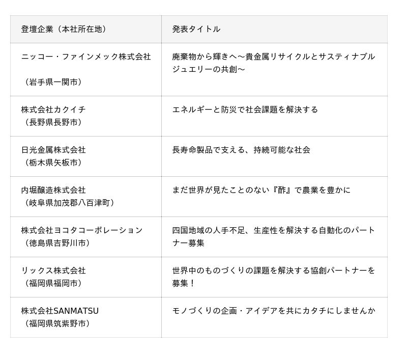 今回のイベントでは、地域未来牽引企業等7社(関東地域からは栃木県及び長野県の企業2社)の新事業創出にむけた共創パートナーとのマッチングを支援します。