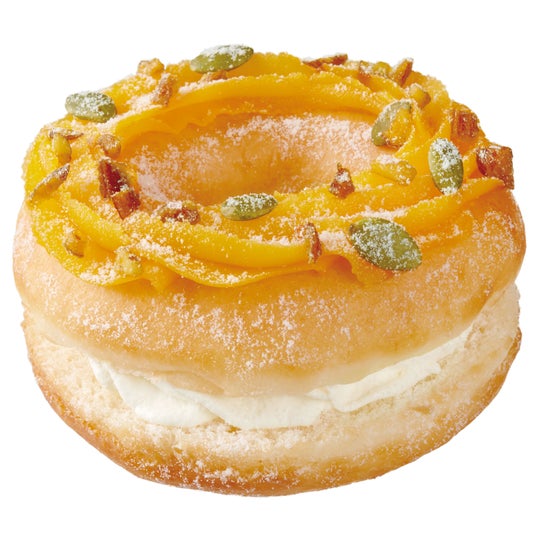 『クリスピー・クリーム・プレミアム 名古屋 パンプキン ミルク』は、秋の味覚の代表のひとつ「かぼちゃ」が主役のドーナツです。軽いくちどけのホイップクリームをサンドしたドーナツ生地の表面に、ほくほくとした甘み豊かな北海道産のかぼちゃあんをぐるっと絞り、キャンディングアーモンドとパンプキンシードで秋らしい香りをトッピング。ダブルのクリームが口の中でリッチに溶け合い、かぼちゃのほくほくとしたやさしい甘さを口いっぱいに堪能できる、秋にぴったりのドーナツです。