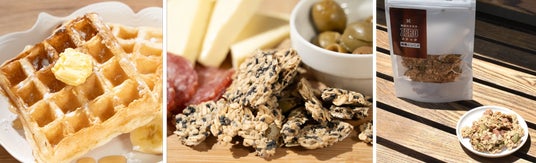 左:グルテンフリー低糖質の豆腐ワッフル、中央:オリジナルのプロテインクラッカー、右:水あめやシロップを使わずに作ったグラノーラ