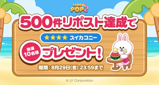 期間中、「LINE POP2」の公式X(旧Twitter)をフォローして該当のポストをリポストすると、限定ミニモン「★4 スイカコニー」が当たります。