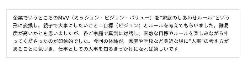 また、子どもに一言で答えられるほどに自身の仕事が言語化できたのは大変嬉しいです。