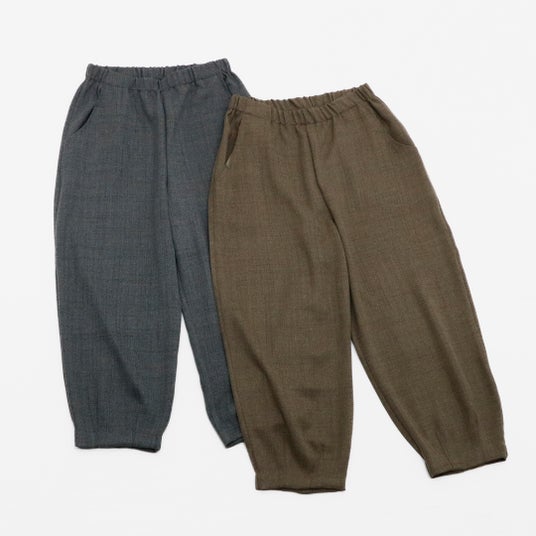 ヒップまわりにゆとりを持たせ、裾に向かってすっきり細く、美しいシルエットと動きやすさを両立させたトレンド感のあるパンツです。上品なツイード調の生地を採用しました。