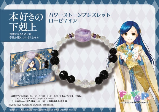 そして今回のPOP UPでは新商品として、ローゼマインとフェルディナンドをイメージしたパワーストーンブレスレットも登場。キャラクターの個性やストーリーを繊細に表現したカラーリングや素材選びで、アクセサリーとしても高い完成度を誇ります。 作品の世界を、身につけて楽しめるファンアイテムとしておすすめです。
