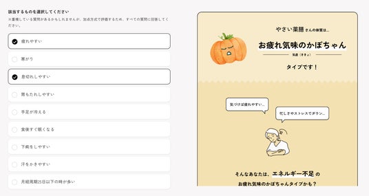 やさい薬膳では、社員一人ひとりが毎日の食事選びを通じて自分の体調に合ったセルフケアを行えるようサポートします。これにより、無理のない健康習慣づくりと、企業の健康経営推進を両立させることを目指します。特徴1.:体質診断テストで毎日の体調を可視化