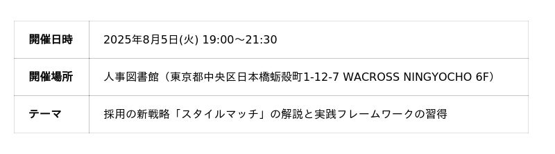 株式会社Trustyyle(本社:東京都中央区・代表取締役:吉田洋介)は、2025年8月5日に運営するコミュニティ「人事図書館」にて、「スペックではなく“スタイル”で 選ばれる時代へ 採用がうまくいく企業の共通点と実践フレームを解説」を開催しました。株式会社No Company(本社:東京都港区)代表取締役社長 秋山真氏による「スタイルマッチ」に関する講演やワークショップが行われ、盛況のうちに終了しました。本記事では、イベント当日の様子や成果についてご報告します。
