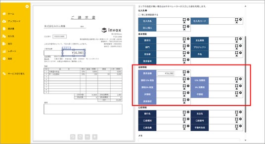 そこでこのたび「読み取りエリア設定機能」に税区分ごとの内訳など「金額」に関する項目を新たに追加し、請求書処理に必要となる主要な項目は、すべて読み取り位置を事前に指定できるようになりました。