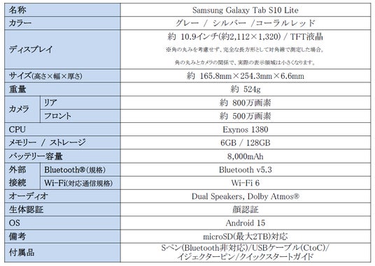 <主な仕様:「Samsung Galaxy Tab S10 Lite」>