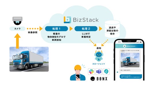 今回BizStackに新たに搭載された車両検知機能は、建設現場や物流拠点などの車輌入場口に設置されたカメラ映像をAIが分析し、車両の進入・退出と車種を自動判定。AIエージェントとして現場を常時監視し、必要な情報をリアルタイムで通知・記録します。- AIによる車両検知・車種判定:カメラ映像から進入・退出を自動検知。作業員による手動記録や報告は不要に。
