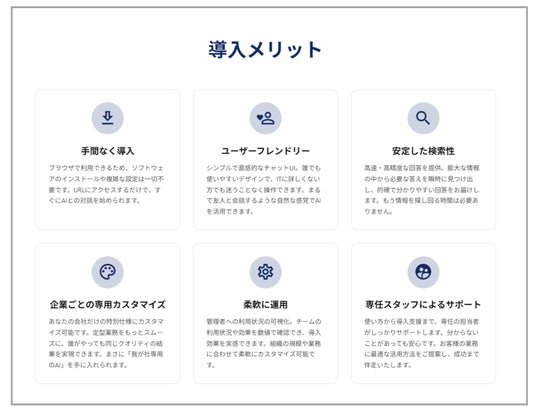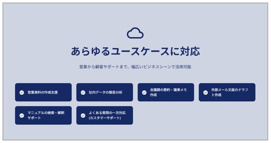 また、問い合わせ対応の効率化やナレッジ共有の属人化解消にもつながり、組織全体の生産性向上に寄与します。社内データや外部情報を安全に扱いながら、日常業務の様々なシーンで活用できる実用性が特徴です。