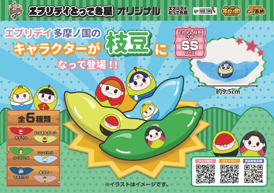 Sサイズは、さや部分がファスナー付きで開閉でき、ぬいぐるみとして楽しむだけでなく、筆箱としても使える実用的なデザイン。さやとは別に展開される豆は、「多摩ノ国」で活躍するキャラクターたちが可愛らしく変身した姿になっており、コレクション性も抜群です。