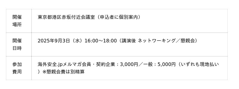 2025年9月3日(水)16:00-18:00、海外安全.jpとASIS日本支部が共同で勉強会/ネットワーキングイベントを開催します。