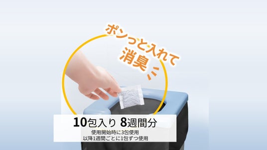 本製品の最大の特長は、「入れるだけ」で簡単消臭が可能な点です。また、初回は3包、その後は1週間に1~2包を便槽に投入するだけで、継続的に効果を発揮します。