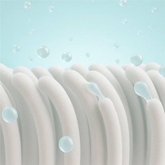 繊維1本1本が水に触れた瞬間から水分をすばやく吸収します。一般的な綿タオルに比べて5倍の吸水力(自社調べ)があるため、タオルドライで髪の水分をしっかり取ることができ、その後のドライヤー時間を短縮。