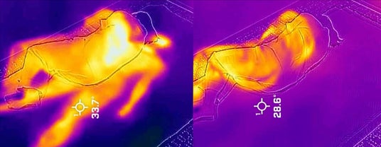 <サーモグラフィーで比較:一般的綿の生地33.7° 瞬間極冷パッド28.6°>