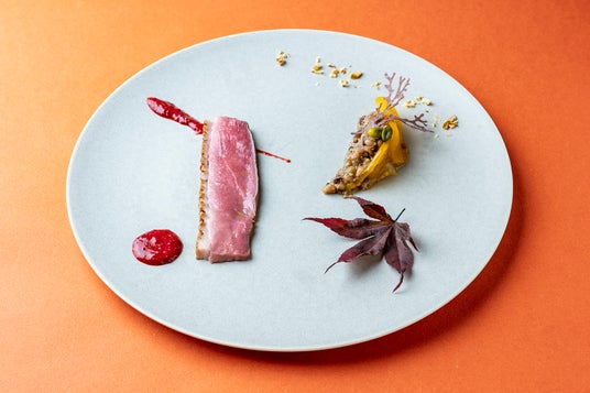 低温調理した鳥市さんのあいち鴨 秋茄子と麦のインサラータ ~野山の収穫祭~