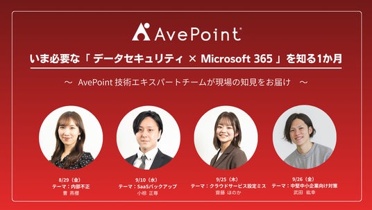AvePoint Japan 株式会社(本社:東京都港区、代表取締役社長:塩光 献、以下「AvePoint」「当社」)は、2025年8月29日(金)から9月26日(木)までの約1か月間を「初秋のデータセキュリティ・ガバナンス月間」と題し、各種メディア主催のセキュリティイベントに登壇いたします。期間中は、Microsoft 365を中心とするSaaS環境のデータセキュリティを多角的に解説し、参加者の皆さまにとって実践的で役立つヒントをご提供します。