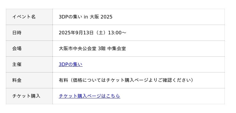「3DPの集い in 大阪 2025」は、大阪で3Dプリンター愛好者や企業関係者が気軽に集まり、「見せて・語れる」をテーマに交流するイベントです。展示・実演・物販・雑談など、多様な参加スタイルで3Dものづくりを楽しむことができます。