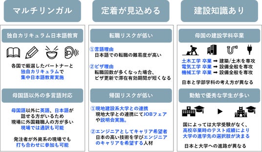 日本国内の建設現場では、建築・土木・電気・設備分野における専門学科卒の日本人若手の採用が非常に困難な状況が続いています。こうした日本人若手の採用難や定着率低下の一方で、技能実習生や特定技能制度を活用した外国籍施工管理技術者人材は増加しており、現場の円滑なコミュニケーションと品質管理を担う管理者層にも外国籍技術者人材が求められる時代になっています。海外には専門性の高い技術・知識を学んだ人材が多数おり、日本では採用の難しい建設系学部卒の採用が可能です。さらに、現地採用段階で1級施工管理技士の取得を目指すエンジニア志望の方を採用することで入社後の定着率が非常に高いという特長があります。