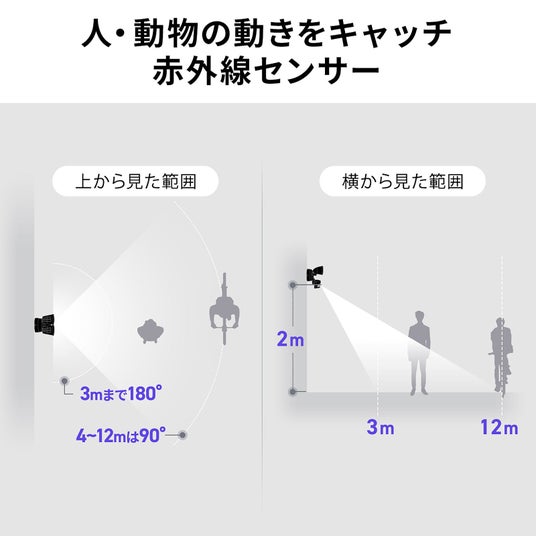 赤外線人感センサーを搭載し、人や車を検知するとライトが自動点灯。同時にカメラ録画を開始し、侵入者を威嚇しながら証拠映像を記録します。常時監視する必要がなく、省エネかつ効率的な防犯対策が可能です。