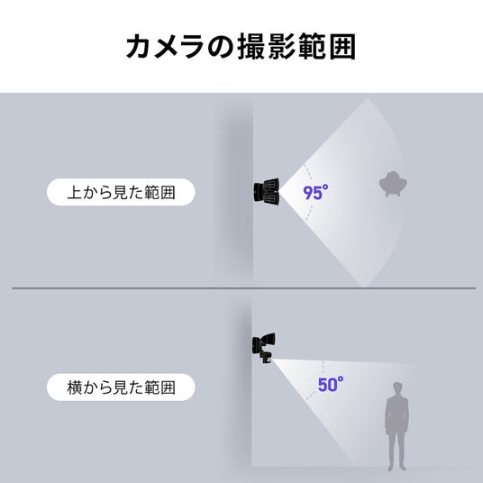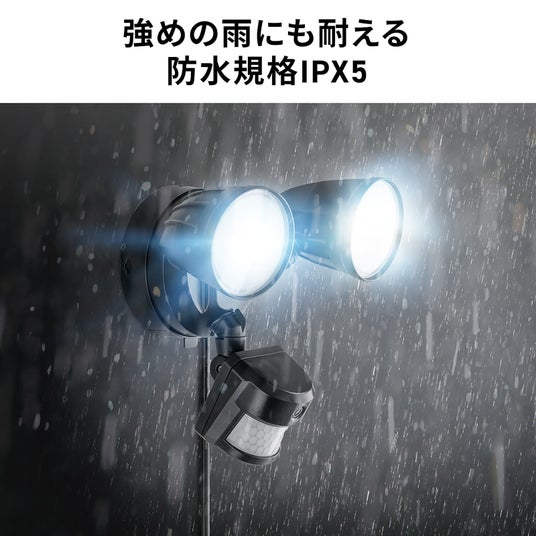 防水性能はIPX5をクリアしており、雨天時でも問題なく使用可能。屋外の玄関、勝手口、倉庫、ガレージなど、幅広い設置環境に対応します。さらに、ライト角度は上下左右で個別調整ができ、必要な範囲を効率的に照らせます。