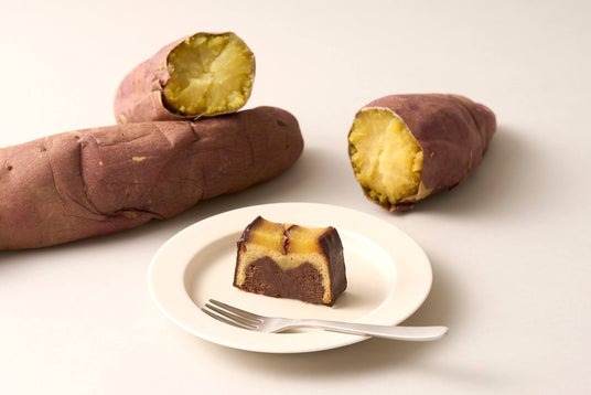 上部には、「金蜜芋」の焼き芋を皮ごと混ぜ込んださつまいも生地を使用し、さらに焼き芋のスライスをそのままトッピング。下部のガトーショコラ生地にも焼き芋を加えることで、芋本来の豊かな香りと濃厚な甘みを楽しめるよう仕立てました。隠し味として、醤油を生地全体に加えることで、奥行きのある旨みをプラスしています。